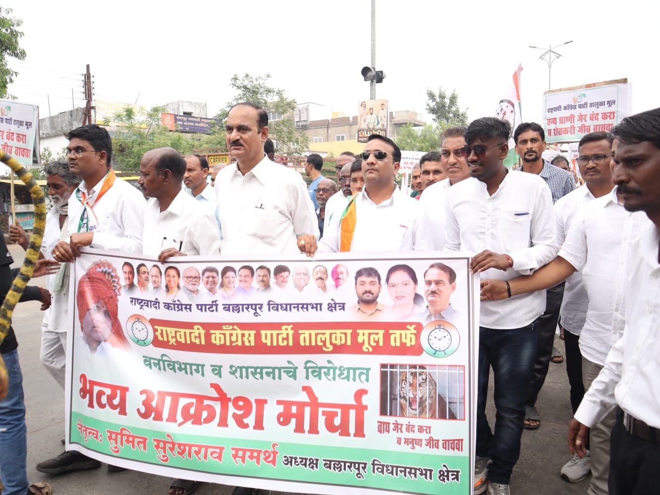 मूल : वन्यप्राण्याच्या हल्लात अनेकांचे बळी जात असुन पाळीव जनावरही मृत्युमुखी पडत आहेत, वन्यप्राण्यांच्या हल्यापासुन जनतेला संरक्षण द्या. अशी मागणी वारंवार होत असताना महाराष्ट्र शासन माञ त्याकडे जाणिवपुर्वक दुर्लक्ष करीत आहे, याच्या निषेधार्थ मूल तालुका राष्ट्रवादी कॉंग्रेस पार्टीच्या वतीने पार्टीच्या बल्लारपुर विधानसभा क्षेञाचे अध्यक्ष सुमित समर्थ यांचे नेतृत्वात आज स्थानिक तहसिल कार्यालयावर आक्रोश मोर्चा काढण्यात आला. स्थानिक गांधी चौकातुन निघालेल्या आक्रोश मोर्चात राष्ट्रवादी कॉंग्रेस पार्टीचे जिल्हाध्यक्ष राजेंद्र वैद्य, ओबीसी नेते जगदीश जुनघरी, तालुकाध्यक्ष प्रा. किसन वासाडे, शहर अध्यक्ष भास्कर खोब्रागडे, महीला आघाडीच्या तालुकाध्यक्षा निता गेडाम, शहर अध्यक्ष अर्चना चावरे, युवक अध्यक्ष समीर अल्लुरवार, मारोती शेंडे आदींसह आबाल स्ञी पुरूष मोठ्या संख्येनी सहभागी झाले होते. बस स्थानक मार्गाने आक्रोश मोर्चा तहसिल कार्यालसमोर पोहोचल्यावर जिल्हाध्यक्ष राजेंद्र वैद्य, विधानसभा अध्यक्ष सुमित समर्थ, जगदीश जुनघरी आदींनी मार्गदर्शन करतांना जनतेच्या प्रती विद्यमान महाराष्ट्र शासन उदासिन असुन विद्यमान शासनकर्त्यांना माणसांपेक्षा वन्यप्राणी महत्वाचे झाल्याचा आरोप केला. यावेळी मोर्चेक-यांच्या वतीने तहसिलदार यांचे मार्फतीने शासनकर्त्यांना निवेदन सादर करण्यात आले. तहसिलदार डाँ. रविंद्र होळी यांनी निवेदन स्विकारले. निवेदनात धुमाकुळ घालणाऱ्या वाघांचा बंदोबस्त करावा, बफरक्षेत्राच्या जंगलाला तारेचे कुंपन करावे, वाघाच्या हल्लात ठार झालेल्या व्यक्तीच्या परिवारातील एका व्यक्तीस शासकीय नौकरी द्यावी, वन्यप्राण्यामुळे शेतक-यांच्या शेतमालाचे नुकसान झाल्यास त्यांना तात्काळ मदत देण्यात यावी, गुरे चराईसाठी जंगल आरक्षित करण्यात यावे, स्वरक्षणासाठी शेतक-यांना हत्यार बाळगण्याची परवानगी देण्यात यावी अश्या विविध मागण्याचे निवेदन देण्यात आले.