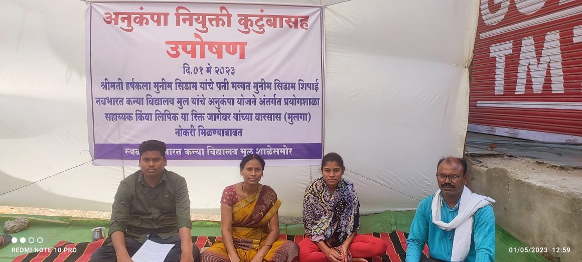 स्थानिक शिक्षण प्रसारक मंडळ द्वारा मूल, राजोली, अंतरगांव आणि व्याहाड येथे मागील अनेक वर्षापासून विद्यालयाचे संचलन केल्या जाते. चार संस्थेपैकी एक असलेल्या 100 टक्के अनुदानावरील नवभारत कन्या विद्यालय मूल येथे शिपाई पदावर सेवारत असलेले मुनीम उध्दव सिडाम यांचे 24 आँगस्ट 2017 रोजी निधन झाले. शासन निर्णयानुसार कर्मचा-याचे सेवाकाळात निधन झाल्यास त्याचे पश्चात कुटूंबातील एका व्यक्तीला सर्वसंम्मतीने अनुकंपा तत्वावर नोकरी देण्याचे निर्देश आहेत. त्यानुषंगाने मृतक मुनिम सिडाम याच्या पत्नी हर्षकला मुनिम सिडाम यांनी मोठा मुलगा आकाश सिडाम याला संस्थेतंर्गत संचलन होत असलेल्या विद्यालयात रिक्त असलेल्या पदावर अनुकंपा तत्वावर नोकरी दयावी. म्हणून शिक्षण प्रसारक मंडळाच्या पदाधिका-यां सोबतचं शिक्षणाधिकारी यांना विनंती केली. संस्थेतंर्गत संचलन होत असलेल्या विद्यालयात शिक्षकेत्तर कर्मचारी संवर्गाचे अनेक पद सेवानिवृत्तीमूळे रिक्त आहेत. त्यामूळे रिक्त असलेल्या चतुर्थ श्रेणी संवर्गात शासन नियामानुसार पत्रव्यवहार करून अनुकंपा तत्वावर सेवेत सामावून घेणे संस्थेला सहज शक्य आहे. परंतू मागील सहा वर्षापासून सतत पाठपुरावा करत असतांना आणि मुलगा शैक्षणीक व शारिरीक दृष्टया पात्र असतांना संस्थेचे पदाधिकारी मूलास अनुकंपा तत्वावर सेवेत सामावून घेण्यास टाळाटाळ करीत आहेत. असा आरोप मृतक मुनिम सिडाम यांची पत्नी हर्षकला सिडाम यांनी केला आहे. सतत पाठपुरावा करूनही शिक्षण प्रसारक मंडळाचे पदाधिकारी मुलास अनुकंपा तत्वावर नोकरीत सामावून न घेता अन्याय करीत असल्याने महागाईच्या काळात कुटूंबाचा उदरनिर्वाह चालविणे कठीण होत आहे. कुटूंबात कोणीही कर्ता व्यक्ती नसल्याने कुटूंब चालवायचा कसा ? असा प्रश्न त्यांचे समोर निर्माण झाल्याने शेवटी न्याय मागणीकडे लक्ष वेधण्यासाठी हर्षकला सिडाम यांनी 1 मे पासून शिक्षण प्रसारक मंडळ द्वारा संचालीत मूल येथील विद्यालयासमोर मुलगा व मूलीसह प्राणांतीक उपोषणाला सुरूवात केली आहे. संस्थेद्वारा संचालन होत असलेल्या पाच विद्यालय आणि महाविद्यालयात शिक्षकेत्तर संवर्गाचे अनेक पद रिक्त आहेत. त्यामूळे संस्थेला शासन निर्णयानुसार आपल्या मुलाला अनुकंपा तत्वावर नोकरी देणे सहज शक्य आहे. परंतू संस्थेचे पदाधिकारी असे न करता अनेक बेरोजगार युवकांकडून लाखो रूपये घेवून नोकरी लावून देतो असे सांगून त्यांना रोजंदारी तत्वावर कामावर घेवून बेरोजगारांची पिळवणुक करीत आहे. असा आरोप स्व. मुनिम सिडाम याच्या परिवाराने केला असून महिण्याभरात मुलाला अनुकंपा तत्वावर नोकरी न दिल्यास नाईलाजास्तव वेगळया आंदोलनाचा पावित्रा घेवू. असा इशारा दिल्याने तालुक्यातील श