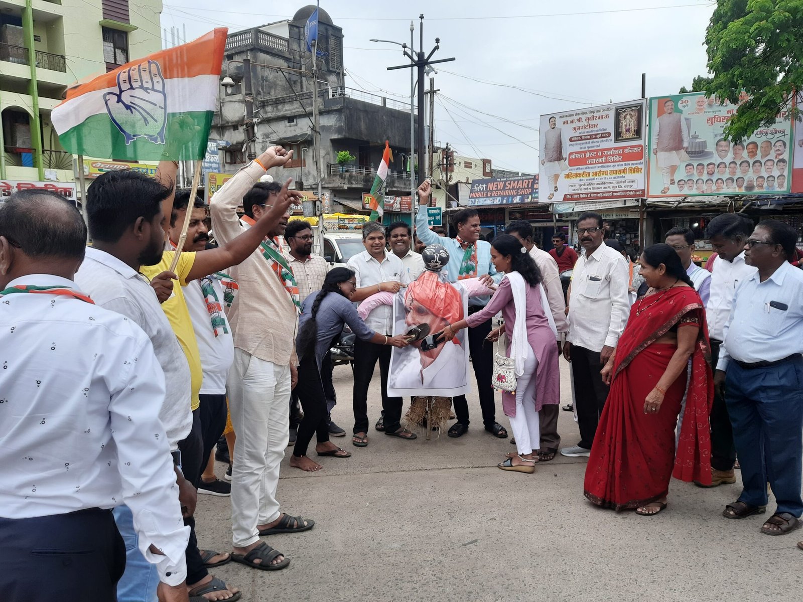 मूल : राष्ट्रपिता महात्मा गांधी यांचे बद्दल अवमानकारक वक्तव्य करून प्रक्षोभक विधानाने सामाजिक एकोपा भंग करू पाहणाऱ्या संभाजी भिडे यांचे विरूध्द कायदेशीर कारवाई करण्यासाठी तालुका व शहर काँग्रेस पार्टीच्या वतीने भिडे यांच्या प्रतिमेला जोडो मारत निषेध करण्यात आला. जिल्हा मध्यवर्ती सहकारी बँकेचे अध्यक्ष तथा काँग्रेस नेते संतोषसिंह रावत यांचे नेतृत्वात स्थानिक गांधी चौकात संभाजी भिडे यांच्या निषेधाचे फलक हाती घेत निदर्शने करण्यात आले. संभाजी भिडेचे करायचे काय ? खाली डोक वरती पाय म्हणत भिडे विरूध्द घोषणा देण्यात आल्या. यावेळी काँग्रेसचे तालुका अध्यक्ष गुरू गुरनुले, शहर अध्यक्ष सुनिल शेरकी, ओबीसी सेलचे प्रदेश सरचिटणीस गुरू चौधरी, बाजार समिती सभापती राकेश रत्नावार आणि ज्येष्ठ कार्यकर्ते बंडु गुरनुले यांनी भिडे यांच्या आक्षेपार्ह विधानावर मत व्यक्त करतांना जाहीर निषेध नोंदविला. यावेळी उपस्थित महीला काँग्रेसच्या पदाधिका-यांनी संभाजी भिडे यांच्या प्रतिमेला जोडो मारत प्रतिकात्मक पुतळ्याचे दहन केले. यावेळी ठाणेदार सुमित परतेकी यांची भेट घेत संभाजी भिडे यांचेविरूध्द गुन्हा दाखल करून अटक करण्यासाठी निवेदन देण्यात आले. यावेळी बाजार समितीचे उपसभापती राजेंद्र कन्नमवार, महिला शहर अध्यक्ष नलीनी आडेपवार, बाजार समितीचे संचालक संदीप कारमवार, हसन वाढई, माजी नगर सेवक विनोद कामडे, लिना फुलझेले, सरपंच रविंद्र कामडे, प्रा, विजय लोनबले, डाँ. पदमाकर लेनगुरे, शामला बेलसरे, वैशाली काळे, उमा बेलसरे, कैलास चलाख, विवेक मुत्यलवार, विष्णु सादमवार, ईश्वर लोनबले, निलेश माथनकर, आकाश दहीवले, सुरेश फुलझेले, संदीप मोहबे, अतुल जेंगठे आदी पदाधिकारी उपस्थित होते.