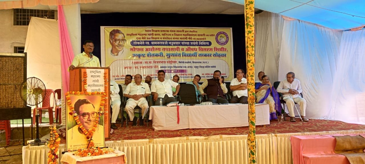 भारत शिक्षण प्रसारक मंडळ सावली आणि राष्ट्रपिता महात्मा गांधी कला वाणिज्य व विज्ञान महाविद्यालय सावलीच्या वतीने आणि विश्वशांती विद्यालय तथा कनिष्ठ महाविद्यालय सावली, कुनघाडा, भेंडाळा, मारोडा आणि बोथलीच्या सहकार्याने आयोजीत संस्थाध्यक्ष स्व. वामनरावजी गड्डमवार जयंती सोहळया निमित्य आयोजीत मोफत आरोग्य तपासणी व औषध वितरण व उत्कृष्ट शेतकरी आणि गुणवंत विद्यार्थ्यांच्या अभिनंदन सोहळयाच्या अध्यक्षस्थानावरून बोलत होते.