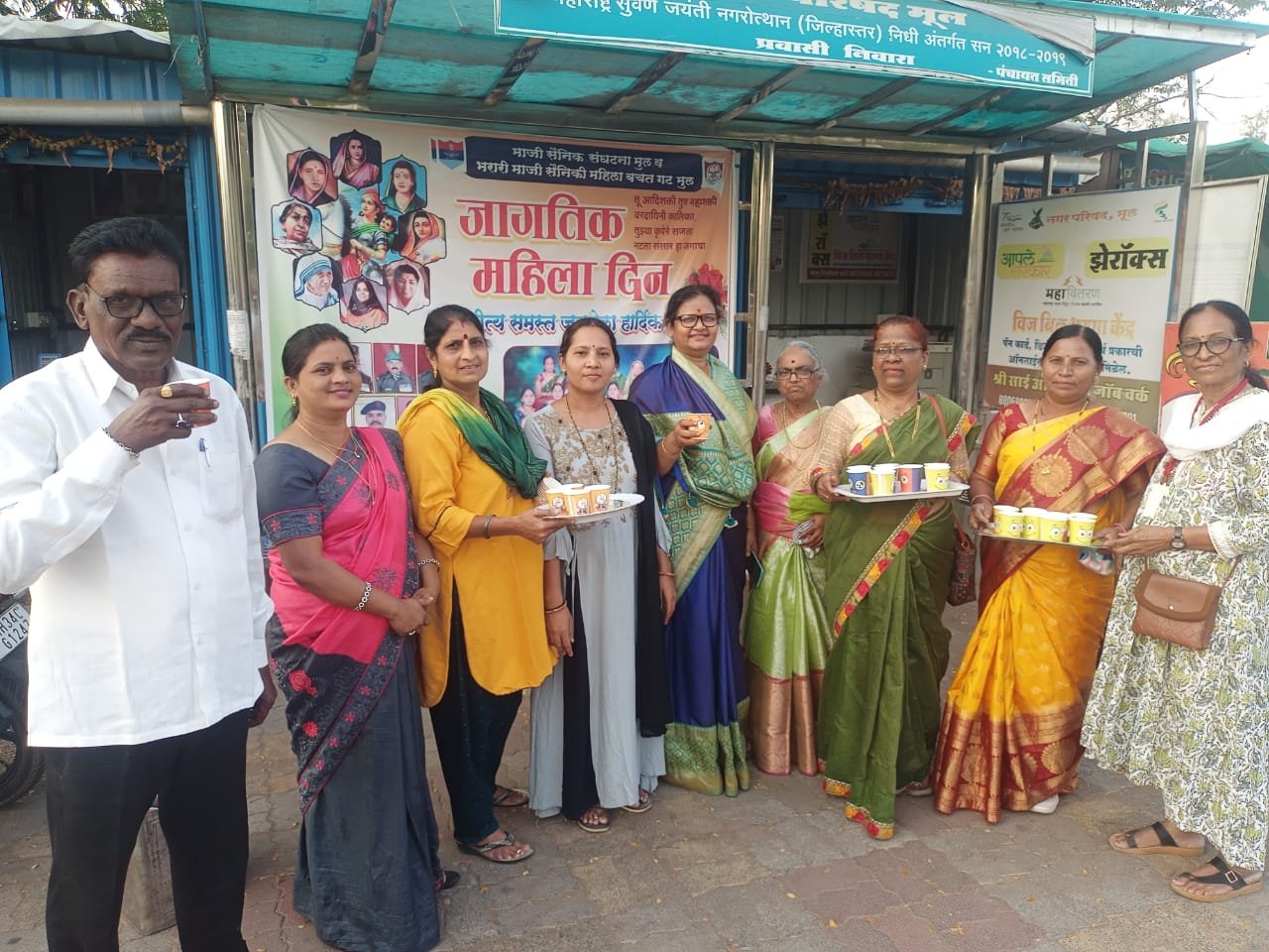 मूल : जागतिक महिला दिनाचे औचित्य साधून स्थानिक माजी सैनिक संघटना आणि भरारी माजी सैनिक महिला बचत गटाच्या वतीने पंचायत समिती समोरील बस थांब्यावर नागरीकांसाठी थंड शरबत वितरण करण्यांत आले. विशेष म्हणजे महाशिवरात्री निमित्य मार्कंडा देवस्थान येथे चंद्रपूर वरून मूल मार्गे भाविक मोठया प्रमाणांत जात असतात. ऐन रहदारीच्या मुख्य मार्गावर माजी सैनिक व भरारी महिला मंडळाच्या सदस्यांनी शरबत व थंड पाणी वितरणाचा कार्यक्रम हाती घेतल्याने सामान्य नागरीकांसोबतचं मार्कंडा देवस्थान येथे जाणा-या भाविकांनी शरबताचा लाभ घेतला. जागतिक महिला दिन आणि महाशिवरात्रीचे औचित्य साधून हाती घेतलेला शरबत वितरण उपक्रमाचा श्रीगणेशा माजी नगराध्यक्ष रत्नमाला भोयर यांचे हस्ते झाला. सदर उपक्रम यशस्वी करण्यासाठी भरारी माजी सैनिक महिला बचत गटाच्या अध्यक्षा अंजली सुर, उपाध्यक्ष पुष्पलता जंबुलवार, सचिव कविता मोहुर्ले, सदस्य पंचशीला खोब्रागडे, सुनिता खोब्रागडे, करूणा खोब्रागडे, उज्वला रंगारी, वंदना निकुरे, माजी सैनिक संघटनेचे बाबा सुर आणि लक्ष्मण निकुरे यांनी परिश्रम घेतले.