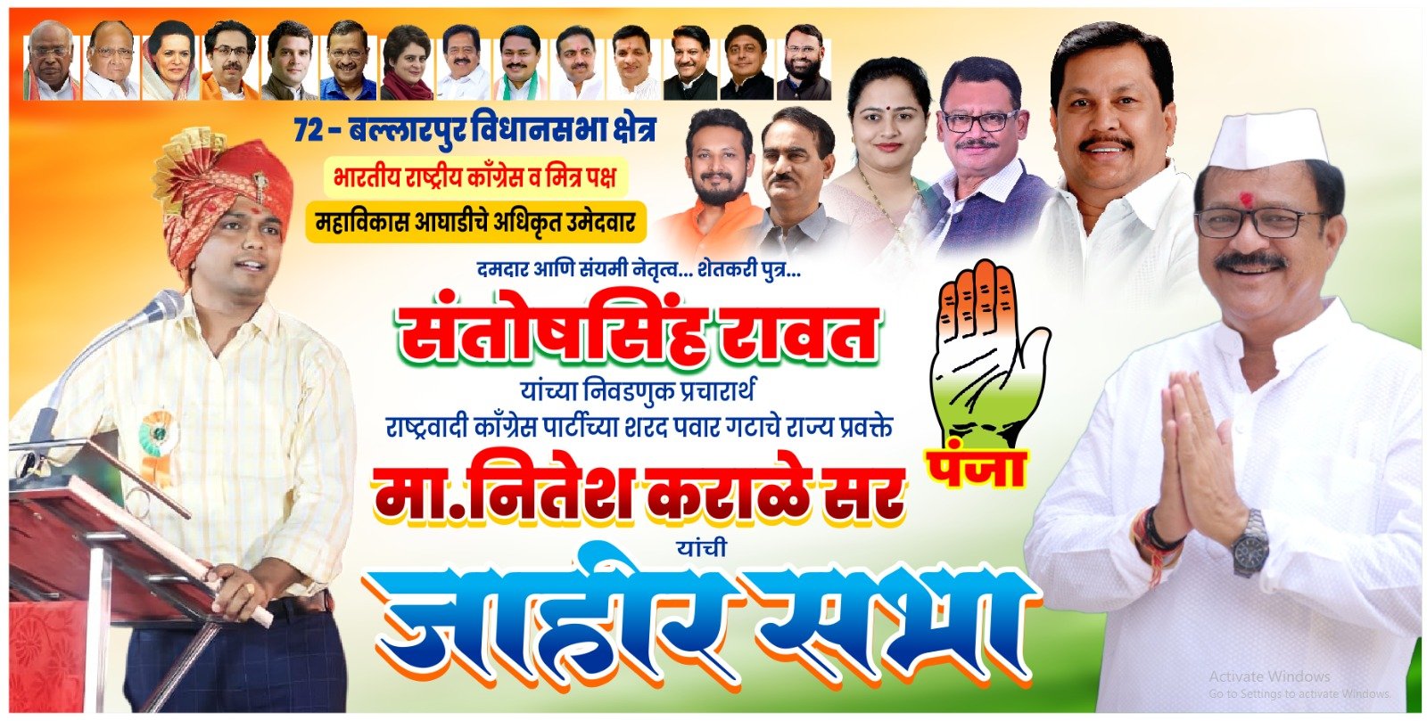 पोंभुर्णा : २० नोव्हेंबर रोजी होवु घातलेल्या राज्य विधानसभेच्या सार्वत्रिक निवडणुकीत बल्लारपुर विधानसभा क्षेत्रात उभे असलेले भारतीय राष्ट्रीय काँग्रेस पार्टी तथा महाविकास आघाडीतील मिञ पक्षाचे अधिकृत उमेदवार संतोषसिंह चंदनसिंह रावत यांच्या निवडणूक प्रचारार्थ राष्ट्रवादी काँग्रेस पार्टीचे प्रदेश प्रवक्ता तथा सुप्रसिध्द वक्ता नितेश कराळे सर यांची प्रचार सभा आयोजित केली आहे. रविवार दिनांक ३ नोव्हेंबर २०२४ रोजी सकाळी ११ वाजता पोंभुर्णा येथील सुमन मंगल कार्यालयात आयोजित प्रचार सभेला उमेदवार संतोषसिंह रावत यांचेसह राष्ट्रवादी काँग्रेस पार्टीचे जिल्हाध्यक्ष राजेंद्र वैद्य आणि महाविकास आघाडीचे जिल्ह्यातील नेते उपस्थित राहणार आहेत. आयोजित प्रचार सभेला नागरीकांनी उपस्थित राहावे. अशी विनंती पोंभुर्णा तालुका काँग्रेसचे अध्यक्ष वासुदेव पाल यांनी केले आहे.