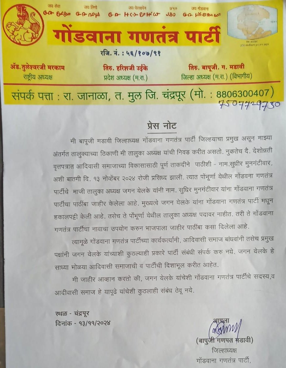 प्रसिध्दीस दिलेल्या पत्रकामधून जिल्हाध्यक्ष बापुजी मडावी यांनी जिल्हयातील सर्व तालुका अध्यक्ष नियुक्त करणे आणि पदावरून कमी करण्याचे सर्वाधिकार जिल्हाध्यक्ष यांना आहे. पोंभुर्णा येथील गोंडवाना गणतंत्र पार्टीचे जगन येलके यांनी निवडणुकीच्या काही महिण्यांपूर्वी समाजाला विश्वासात न घेता काही बाबी समाज विरोधी केल्या. त्यामूळे समाजातील शेकडो बंधु भगिनींना नाहक त्रास सहन करावा लागला. या घटनेची दखल घेवून गोंडवाना गणतंत्र पार्टीचे राष्ट्रीय अध्यक्ष अँड. तुलेश्वरजी मरकाम आणि प्रदेशाध्यक्ष हरीशजी उईके यांच्या सहमतीने जिल्हाध्यक्ष या अधिकारान्वये जगन येलके यांची गोंडवाना गणतंञ पार्टीच्या पोंभुर्णा तालुकाध्यक्ष पदावरून हकालपट्टी केली. असे असतांना होवू घातलेल्या विधानसभा निवडणुकीत जगन येलके यांनी भोळया आदिवासी समाजाला विश्वासात न घेता भाजपा उमेदवार सुधीर मुनगंटीवार यांचेशी संधान साधून सभेचे आयोजन केले. पार पडलेल्या सभेत गोंडवाना गणतंत्र पार्टीशी कोणताही संबंध नसतांना जगन येलके यांनी गोंडवाना गणतंत्र पार्टीचा सुधीर मुनगंटीवार यांना जाहीर पाठींबा जाहीर केला. मुनगंटीवार यांना पाठींबा जाहीर केल्याच्या बातम्या काही वृत्तपत्रामधून प्रकाशीत होताच पार्टीच्या पदाधिका-यांना आश्चर्य वाटले. ज्या व्यक्तीचा पार्टीशी कोणताही संबंध नाही त्याने पार्टीचा पाठींबा जाहीर कसा काय केला ? या प्रश्नावर चर्चा झाल्यानंतर असे ठरविण्यांत आले की, जगन येलके यांनी जाहीर केलेल्या पाठींब्यावर आदिवासी समाजातील बंधु-भगिनी आणि युवा मित्रांनी विश्वास न ठेवता व त्याचेशी कोणताही संपर्क न करता गोंडवाना गणतंत्र पार्टीच्या अधिकृत उमेदवाराच्या पाठीशी भक्कमपणे उभे राहावे. असे आवाहन जिल्हाध्यक्ष बापुजी मडावी यांनी प्रसिध्दीस दिलेल्या पत्रकामधून केले आहे.
